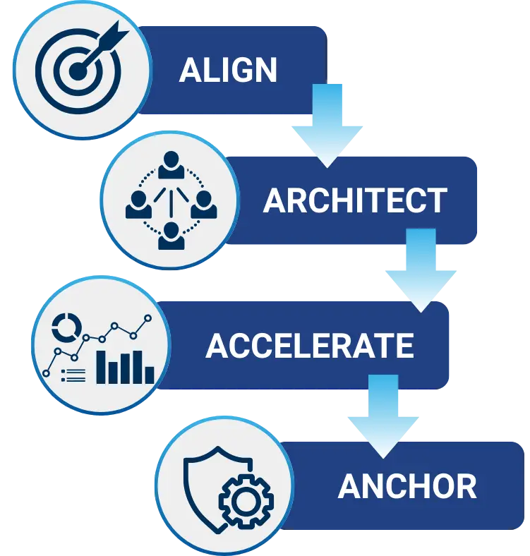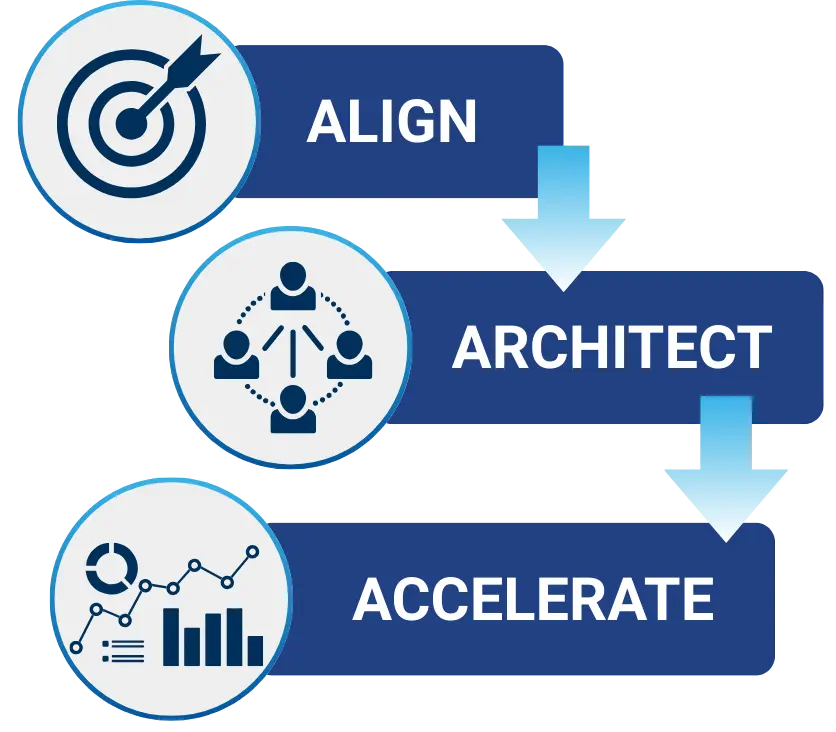 Then we ACCELERATE execution by installing review rhythms, dashboards, and communication routines